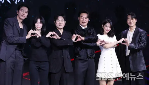 Actors Lee Kwang-soo (from left), Gong Seung-yeon, Kim Sung-kyun, Lee Heejun, Shin Mina, and Park Hae-soo attended the press conference for the Netflix series 'Karma' held at JW Marriott Dongdaemun Square in Seoul's Jongno District on the morning of the 31st, where they posed for photos.