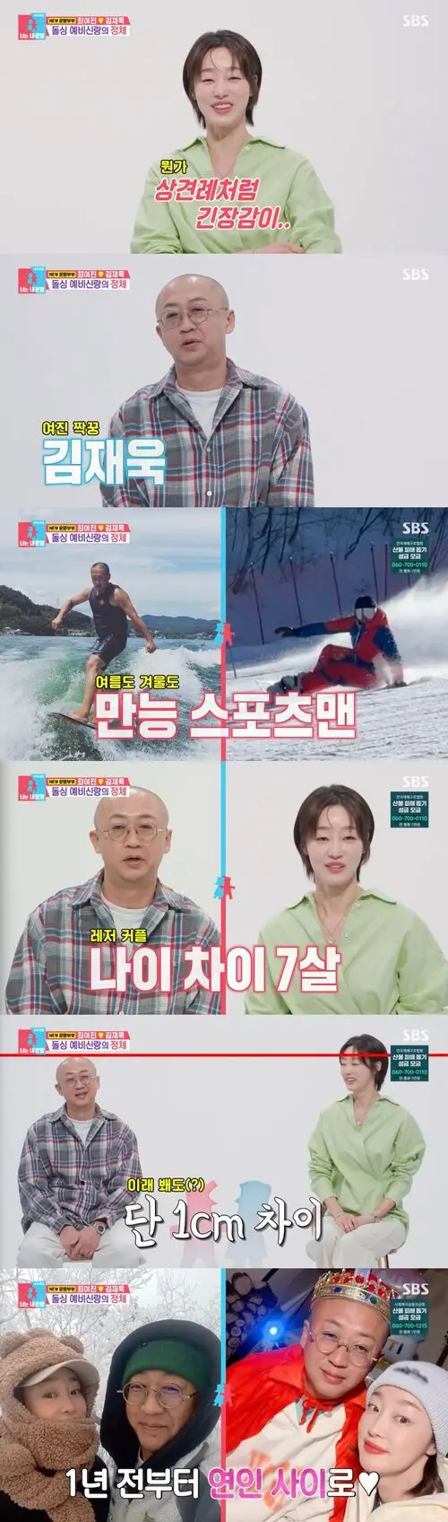 She then formally introduced her partner, saying, "This is my partner, Kim Jae-wook." Kim Jae-wook described himself, saying, "I run a leisure business. I used to be a maritime police officer and a license examiner. I was also a board member of the Korean Sports Association, a referee, and a professional snowboarder. Now, I've retired from sports and run a board school."