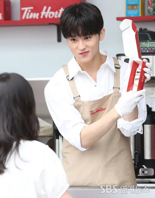 Mark from the group NCT attended the grand opening event of a Tim Hortons store at Lotte World Mall in Songpa-gu, Seoul, on the afternoon of the 9th, where he posed for photos.