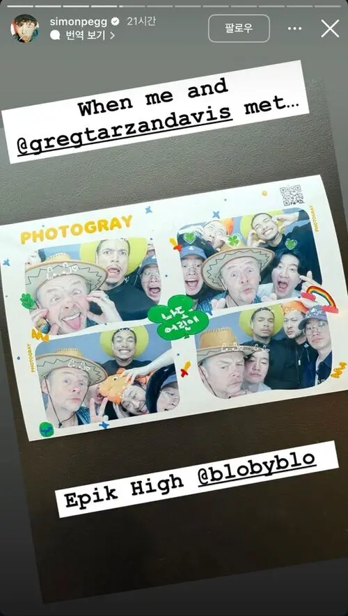 Actor Simon Pegg took to his social media on the 8th to share a story post featuring himself with the members of Epik High.