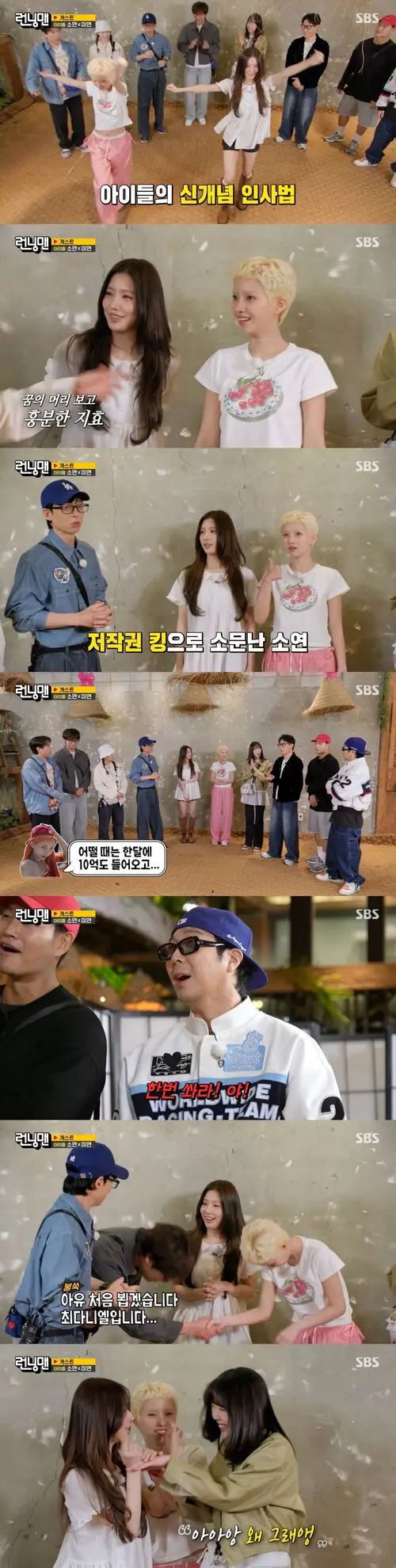 Upon their arrival, Song Ji-hyo excitedly pointed out SOYEON's hairstyle, saying, "That's the hairstyle I've been wanting to try. I even got my hair cut like that because I wanted it so badly," which brought laughter to the set.