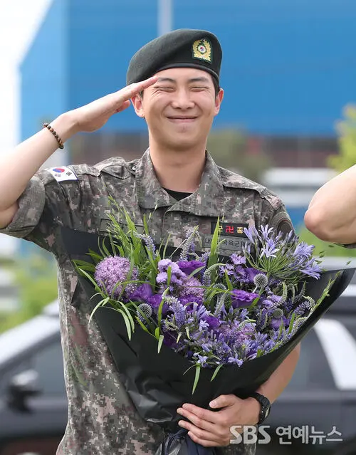 Having completed his military service, BTS's RM was spotted giving a salute to the press at his discharge ceremony held at the Shinbuk Sports Park in Chuncheon, Gangwon Province, on the morning of June 10th.