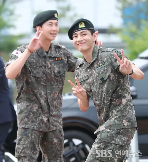 After completing their military service, BTS members RM (on the left) and V were spotted leaving the discharge ceremony held at Shinbuk Sports Park in Chuncheon, Gangwon Province, on the morning of June 10th, flashing V-signs and exiting with smiles.
