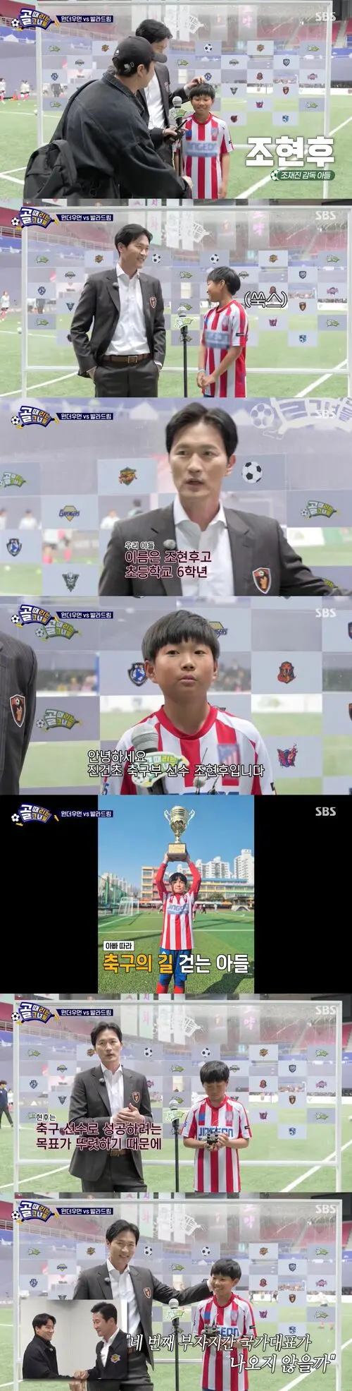 Coach Cho introduced his son, saying, "This is Cho Hyun-hoo, a sixth grader in elementary school." His son added, "I'm Cho Hyun-hoo, a soccer player for Jin Geon Elementary School."