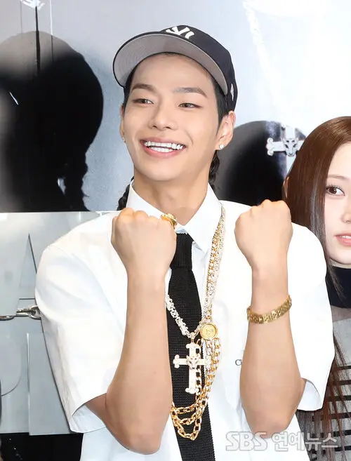 TARZZAN from the group ALLDAY PROJECT poses at the photo wall event commemorating the opening of a pop-up store held at LG U+ in Gangnam-gu, Seoul on the afternoon of June 23.