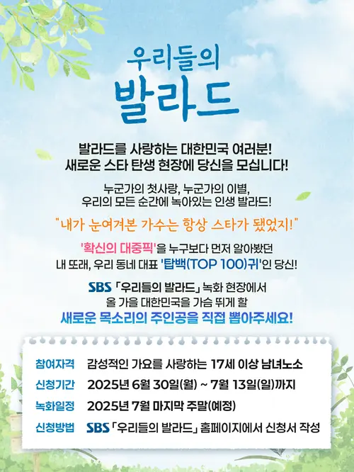 'Our Ballad' aims to find the next voice that resonates with the current era, following in the footsteps of legendary artists like Lee Moon-sae and IU. This music audition show has garnered attention for its collaboration between Jung Ik-seung PD, known for producing major SBS audition and music shows that introduced talents like AKMU, Jung Seung-hwan, and Lee Hi in 'K-pop Star', and BIBI and Car, the Garden in 'The Fan', and writer Mo Eun-seol, who showcased her unique writing skills in Netflix's global hit 'Culinary Class Wars' in 2024.