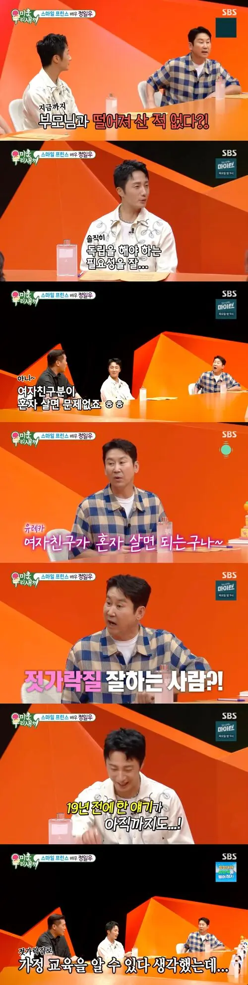 Host Shin Dong-yup noted that Jung has never lived apart from his parents. Jung explained, “Since I became an actor, my parents have been very hands-on, so I never really felt the need to move out. They’ve told me, ‘Once you get married, then you should get your own place.’”