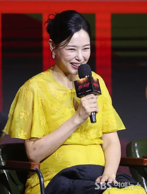Actress Lee Hanee took the mic at the press conference for the Netflix series "Aema," held at Hotel Naru Seoul MGallery in Mapo-gu, Seoul, on the morning of the 18th―greeting the media as she promotes the show just weeks before her August due date.