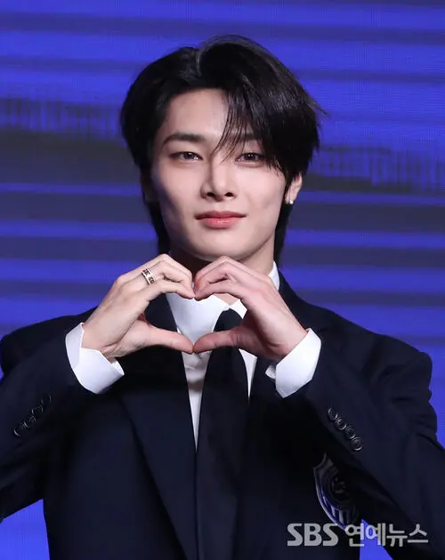 I.N of Stray Kids, the group's youngest member, attended a press conference for the fourth studio album, 'KARMA,' at Conrad Seoul in Yeongdeungpo-gu on the morning of Aug. 22, striking a cute heart pose during the photo call.