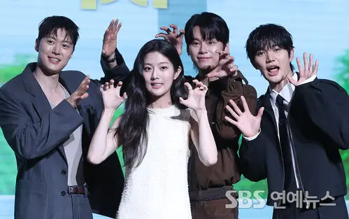 From left, Gong Myung, Shin Eunsoo, Cha Woomin, and Yoon Sang Hyun step out for a photo call at Hotel Naru Seoul - MGallery in Mapo-gu, Seoul, during a press conference for the Netflix film 'Love Untangled' on Aug. 25. The youthful cast served school-trip vibes as they posed for the cameras.
