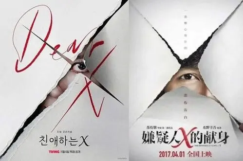 [Photo: "Dear X" launch poster (left) and "The Devotion of Suspect X" poster]