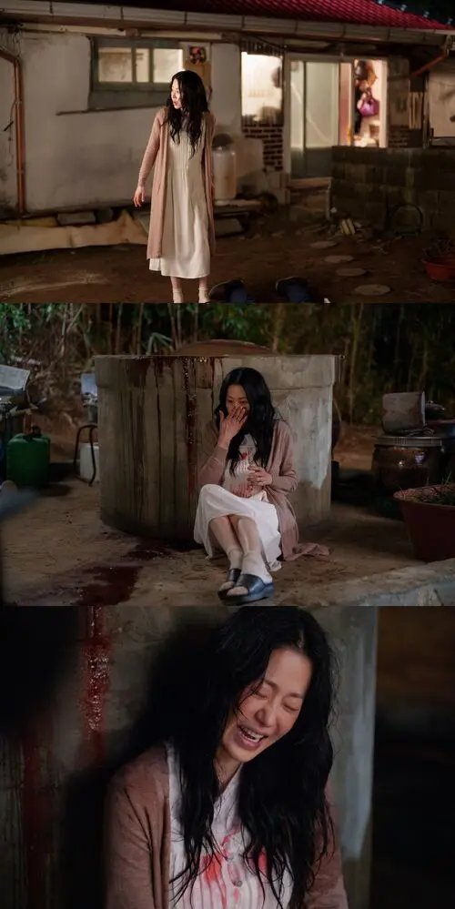 In the images, Jung Yi-shin steps outside late at night, scanning her surroundings with mounting panic. In the next shot, her once-white dress is drenched in crimson―its source unknown―while blood streams from a well where she’s slumped in shock. The final still freezes on a ghastly grin, her face and body soaked in red, equal parts terrifying and mesmerizing.