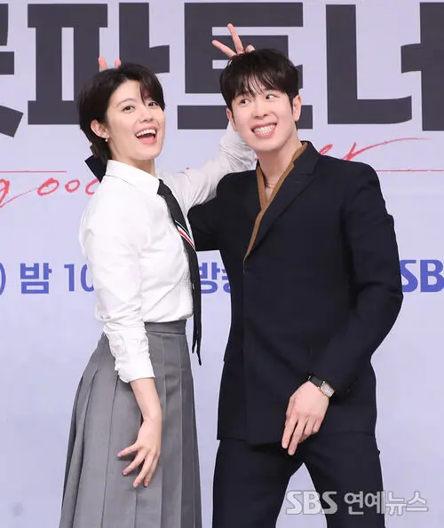 Nam Ji-hyun (left) and P.O (Pyo Ji-hoon) hit the photo line at SBS headquarters in Mok-dong, Seoul, during the press conference for the new Friday-Saturday drama 'Good Partner' on July 10. The duo star as bold Gen Z rookie attorneys in the series.