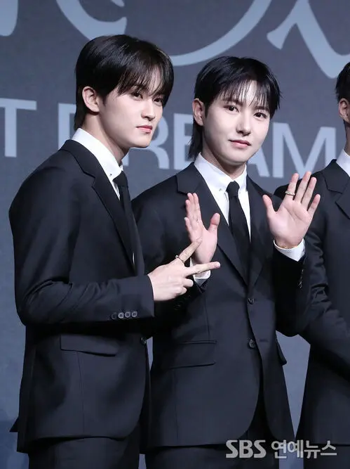 NCT DREAM's MARK (left) and RENJUN hit the photo line at Grand Walkerhill Seoul on March 25, stepping out for a press conference celebrating the group's new album, 'DREAM( )SCAPE.' The duo served easy smiles and playful poses, turning the moment into a full-on charm offensive.