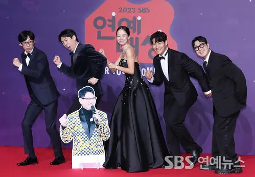 The Running Man team―Yoo Jae-suk, Yang Se-chan, Song Ji-hyo, Kim Jong-kook, and Haha―hit the red carpet at the 2023 SBS Entertainment Awards at SBS Prism Tower in Seoul on Dec. 30, striking poses for the cameras.