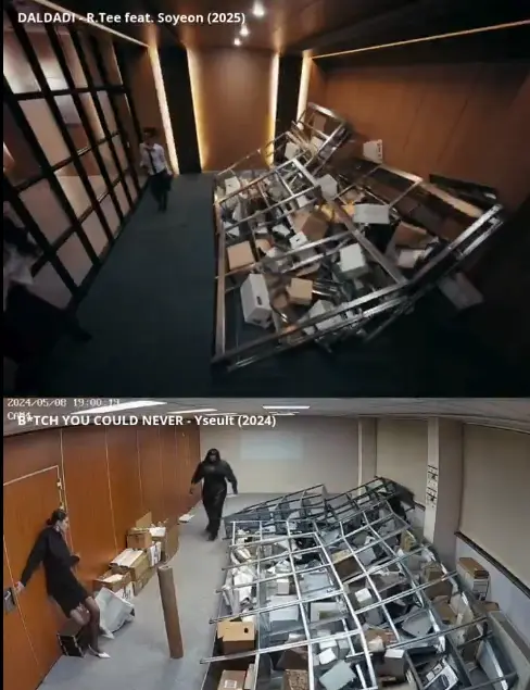 In "DAMDADI," the artist strides down an office-like hallway, grabs a male employee's tie, topples warehouse shelves, and dances alongside office staff―moments that mirror specific scenes from "B*TCH YOU COULD NEVER."