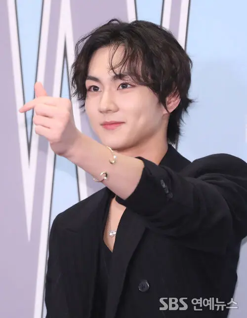 ENHYPEN's JUNGWON hit the photo wall at the Breast Cancer Awareness Campaign on Oct. 15 at the Four Seasons Hotel in Seoul, flashing a finger heart and serving easy charm for the cameras.