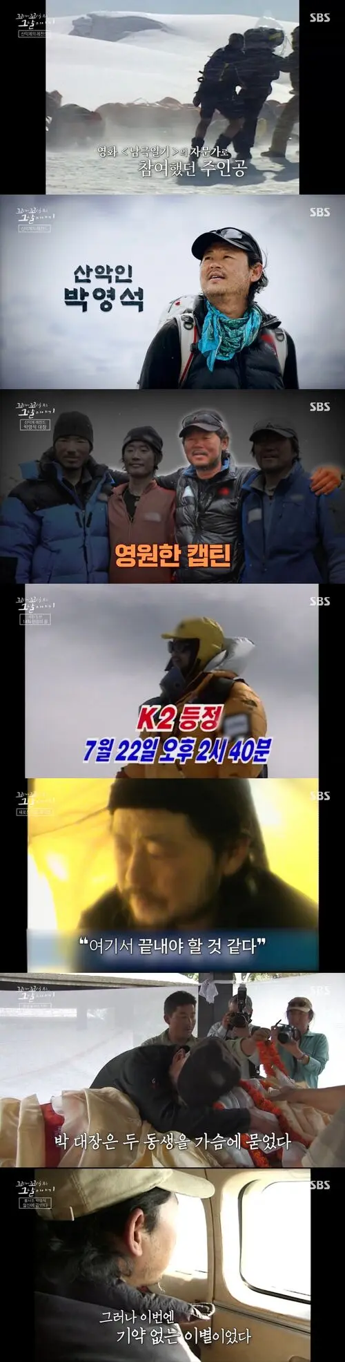 On the Oct. 16 episode of SBS’s "Tails of Tales," subtitled "Still There: Captain Park Young-seok," the docu-series traced the relentless life of a mountaineer who chased his dream to the very end.