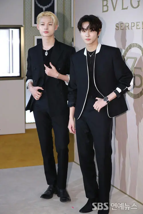 ENHYPEN's NI-KI (left) and JUNGWON stepped out on June 28 at Seoul's Kukje Gallery for an Italian jewelry brand exhibition, posing for photographers on the event's photo wall.
