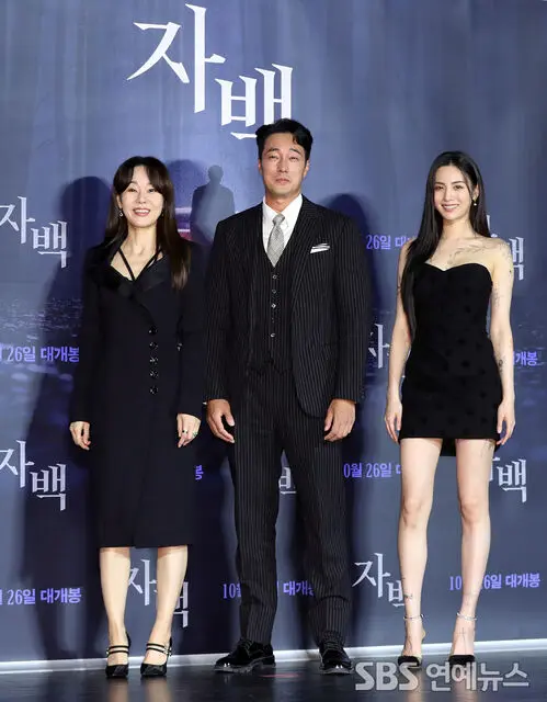 Kim Yun-jin, So Jisub and NANA pose for photos at the press briefing for the film 'Confession,' held at Lotte Cinema Konkuk University in Seoul's Gwangjin District on the morning of Sept. 20. The trio lead the mystery thriller 'Confession'.