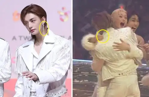 Soon, the other members joined the search. Moments later, FELIX fished the missing piece out of a gap in the stage and held it up, prompting HYUNJIN to pull him into a hug as the group cheered like they’d just struck gold. Photos from the preshow show HYUNJIN wearing both earrings, suggesting one flew off during the high-impact choreography.