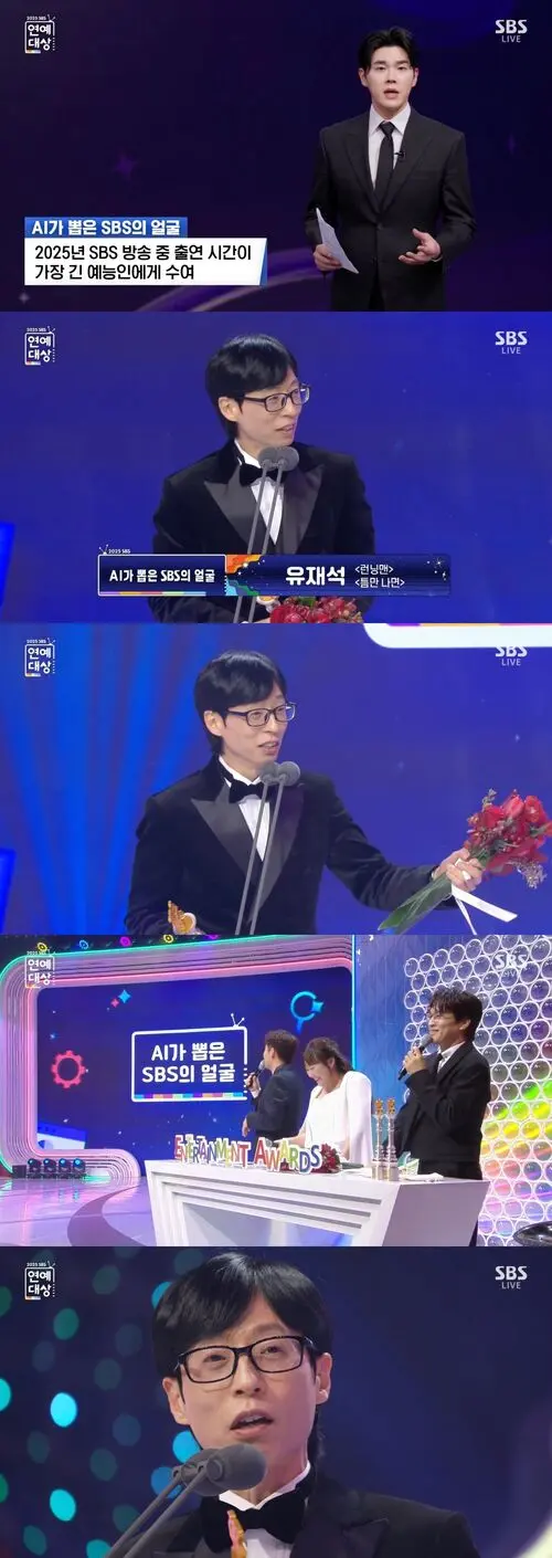 The AI-driven award goes to the variety star with the most on-air time on SBS in 2025. Yoo topped the list with more than 900 minutes, clinching the title.