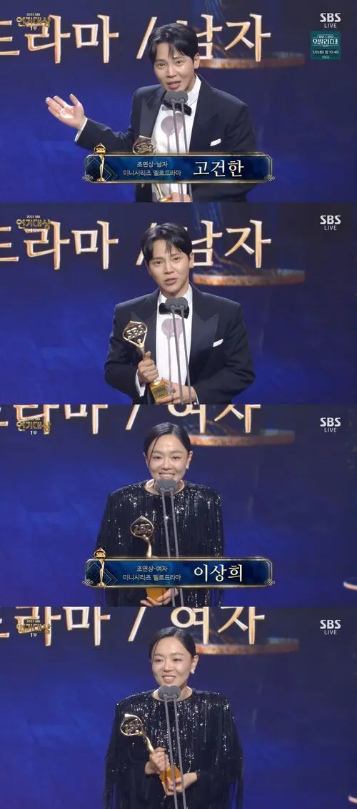 At the 2025 SBS Drama Awards, broadcast live from SBS Prism Tower in Seoul’s Sangam district on Dec. 31, Go Geon-han and Lee Sang-hee took home the Supporting Actor and Supporting Actress trophies in the Mini-Series (Melodrama) category.