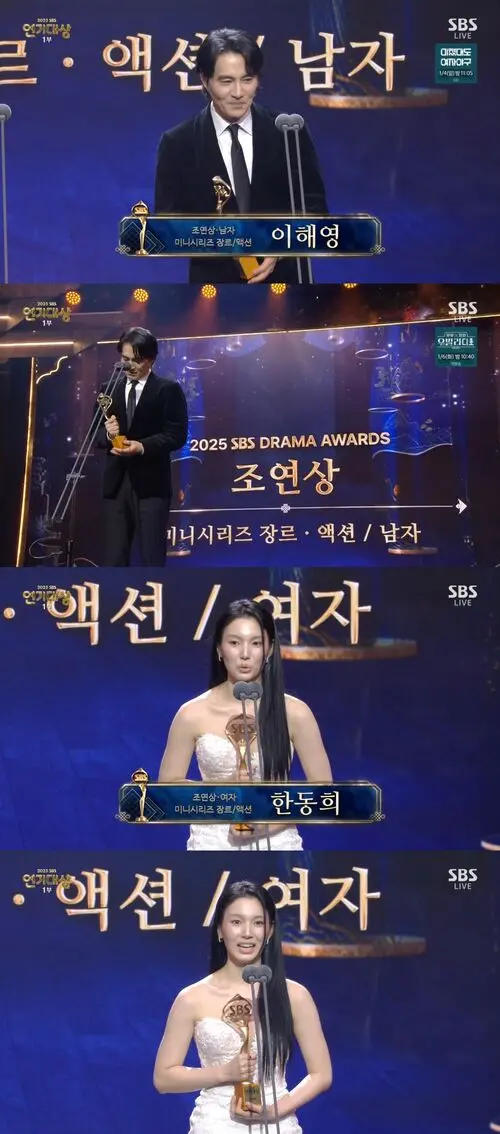 Broadcast live from 8:50 p.m. at SBS Prism Tower in Sangam-dong, Mapo-gu, Seoul, the 2025 SBS Drama Awards honored Lee Hae-young and Han Dong-hee with Supporting trophies in the Miniseries Genre/Action category.