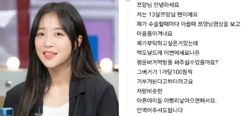 Tzuyang answered with a challenge video polishing off 10 Lucky Burgers and pledged a donation―then followed through, sending 50 million won under the name “Tzuyang and 13 Million Subscribers.”