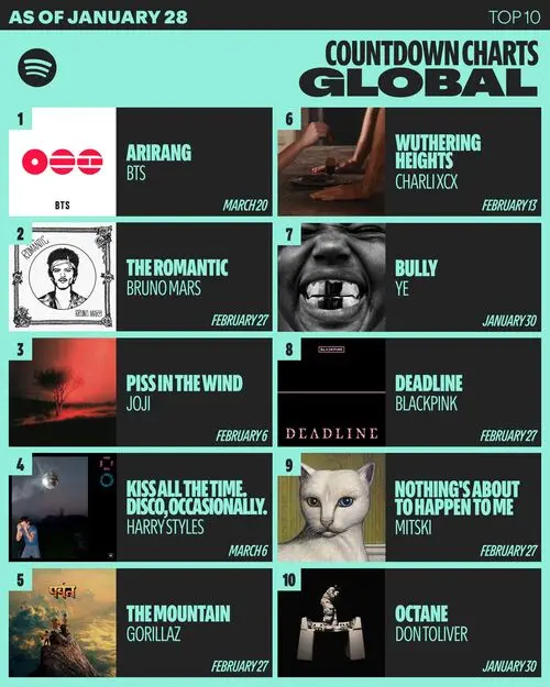 "ARIRANG" also ruled Spotify’s Countdown Charts Global for two straight weeks (weeks of Jan. 21 and Jan. 28). The chart tracks pre-saves for upcoming albums and singles ― a reliable bellwether for global demand.