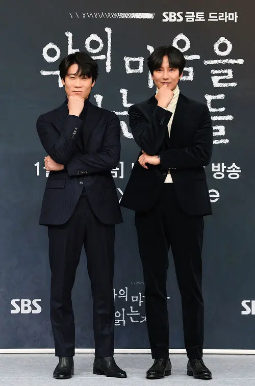 Jin Sun-kyu (left) and Kim Nam-gil pose during the online production presentation for SBS’s new Friday-Saturday drama Through the Darkness, held at SBS in Mok-dong, Yangcheon-gu, Seoul, on the afternoon of the 11th.