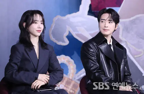 Shin Haesun (left) and Lee Jun-hyuk attended the production presentation for the Netflix series The Art of Sarah at the Ambassador Seoul Pullman Hotel in Jung-gu, Seoul, on the morning of the 10th, taking part in a talk session.