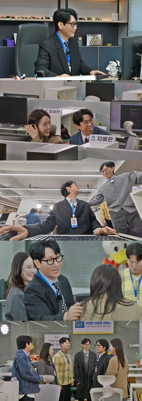 In the pre-recording, the members show up as staffers at the rising industry player “Run & Fun Event Company.” Yoo Jae-suk returns as “Manager Yoo,” with Ji Seok-jin as “Senior Managing Director Ji,” Kim Jong-kook as the “Old-School Assistant Manager,” Haha as the “Young-Forties Manager,” Song Ji-hyo as the “Drinks Manager,” and young rookies Yang Se-chan and Ji Ye-eun. Expect these offbeat characters to shake up the entire office vibe.