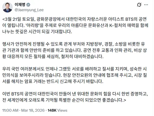 On the 17th, speaking about BTS’s Gwanghwamun Plaza show, President Lee said, “A performance by BTS, the pride of the Republic of Korea, is taking place.” He added, “With ‘Arirang’ as its theme, I hope it becomes a meaningful moment to share our beautiful cultural heritage and the charm of K-culture.” He emphasized, “May this concert once again prove the great cultural power created by Korea and become a special moment long remembered around the world.”