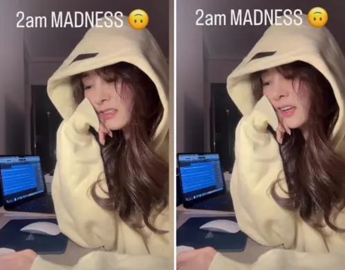 She softly hums, “Melodies keep coming to me. I don’t know how to play it yet, but it’s okay―I can try again,” giving fans a candid peek into her creative process. The late-night grind shows her passion for music is still very much alive.