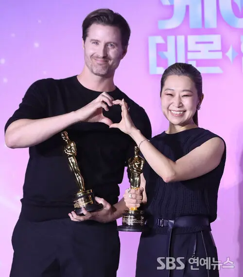 Chris Appelhans (left) and director Maggie Kang pose for photos at a press conference celebrating KPop Demon Hunters’ Academy Award win, held at CGV Yongsan I’Park Mall in Yongsan-gu, Seoul, on the afternoon of April 1.