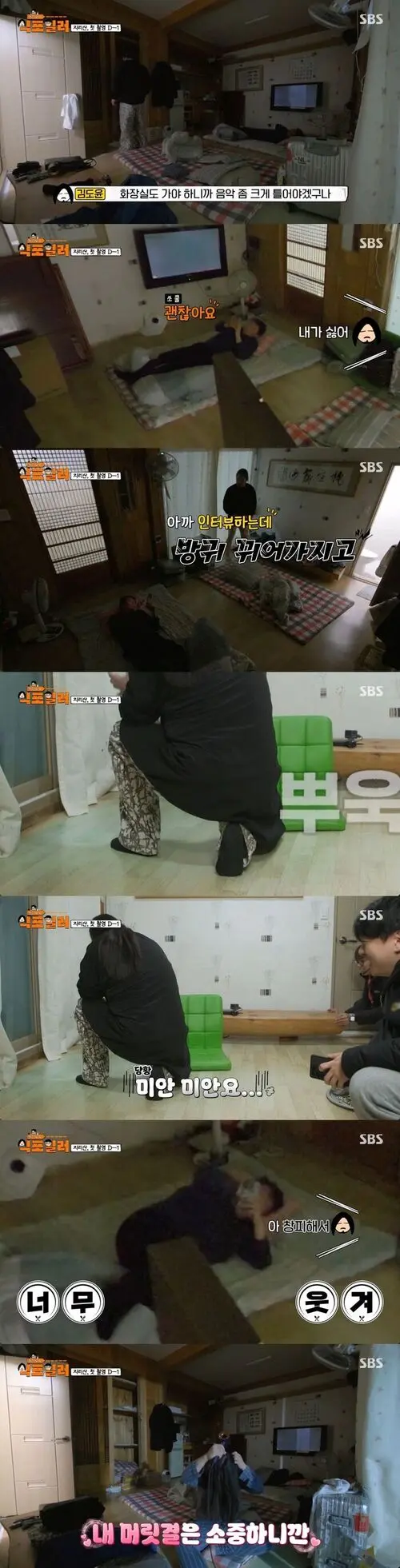 After his shower, Kim carefully dried his hair. Choi described the sight: “You were sitting there at dawn looking like a jellyfish. It was really scary,” drawing laughs with the vivid image.