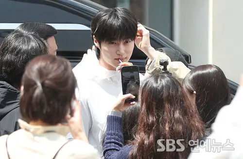 Byeon Wooseok is seen touching up his makeup while attending a fashion brand photo wall event held in Seongsu-dong, Seongdong-gu, Seoul, on the afternoon of April 29.
